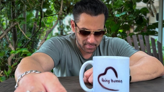 In the picture, Salman Khan looks cool in a grey tee, paired with shades and his signature blue stone bracelet. A Being Human mug is seen on the table right in front of him. The relaxed vibe is further enhanced by the greenery visible in the background.